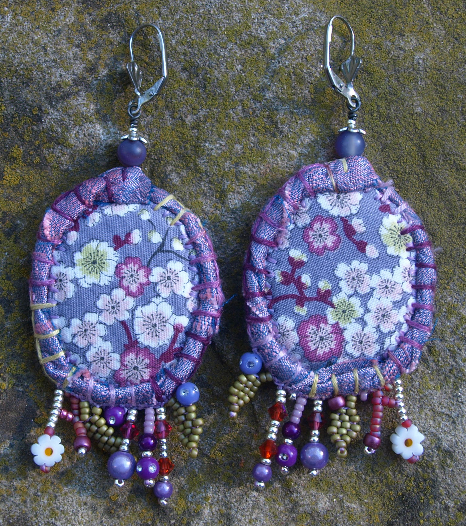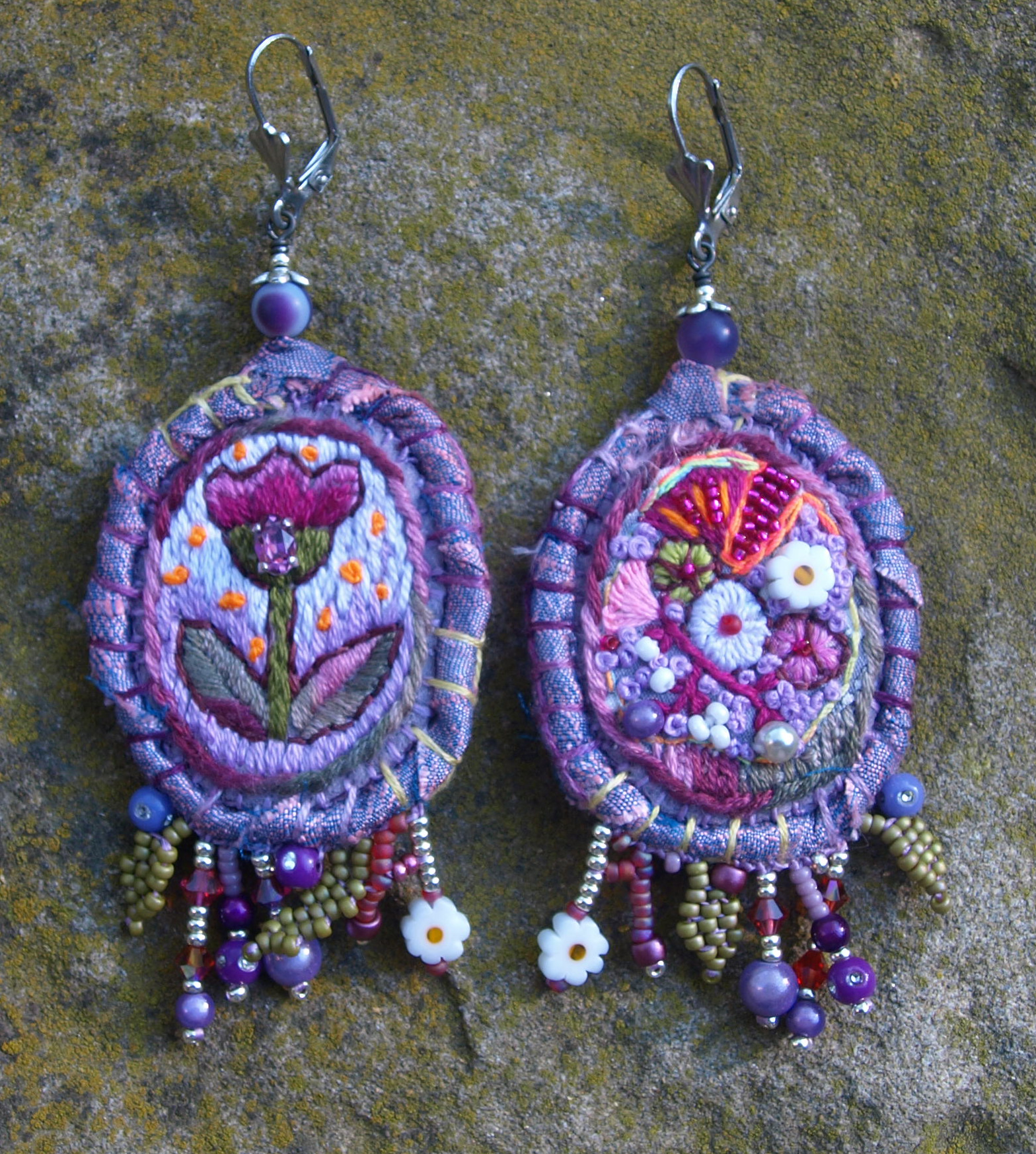 Broderie de fils et de perles diverses . Doublure coton imprimé . Bases : dormeuses acier inoxydable .