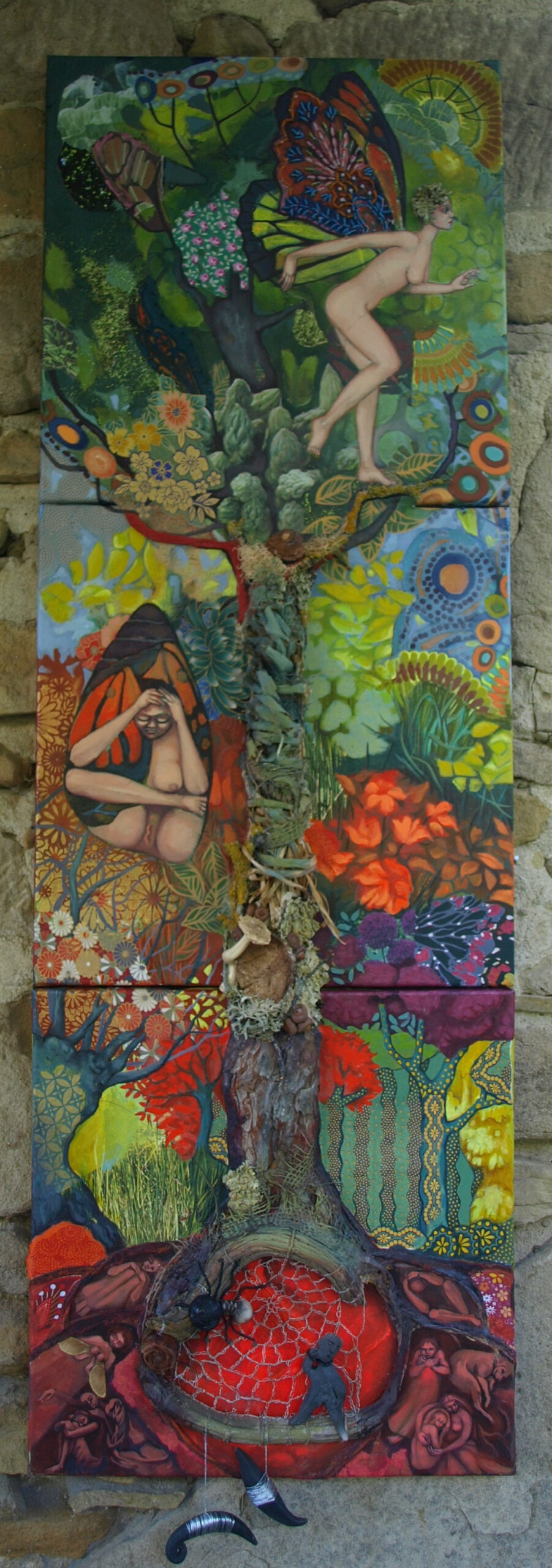 Tryptique-40×120-cm . Collage de matériaux divers, peinture acrylique extra-fine, crochetage de fil d’argent, pièces en raku , matières végétales .