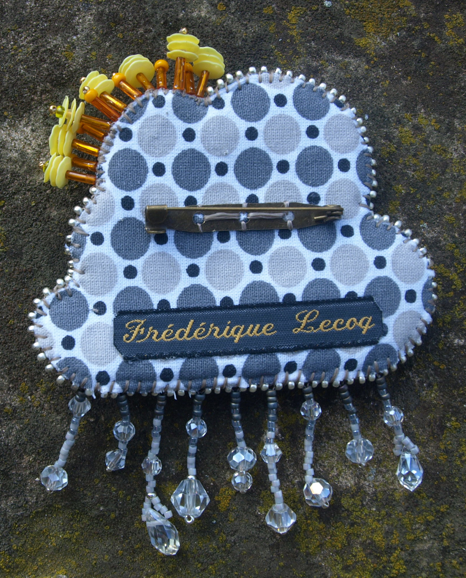 Broderie de fils , sequins , cristaux et perles , sur du feutre de laine . Doublure , coton imprimé et signé.