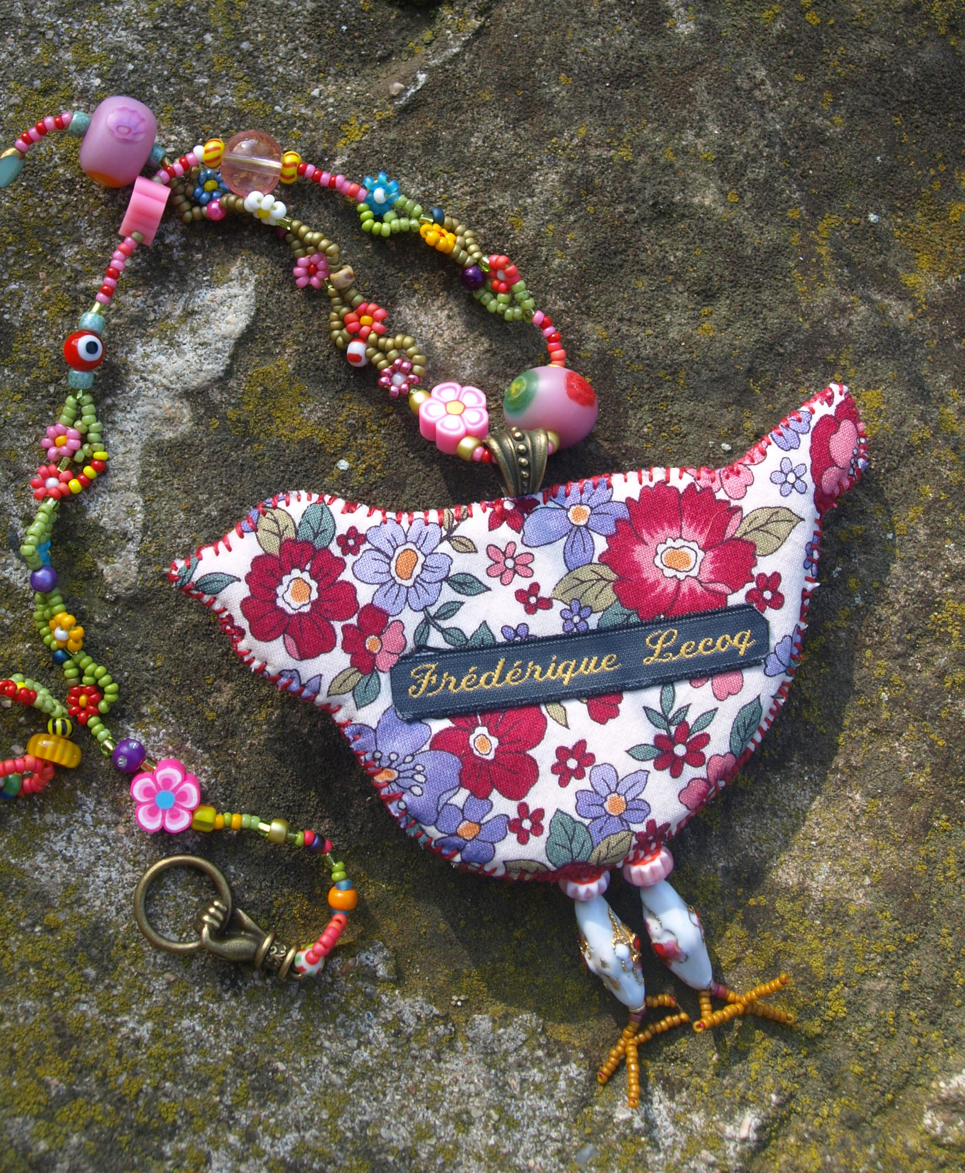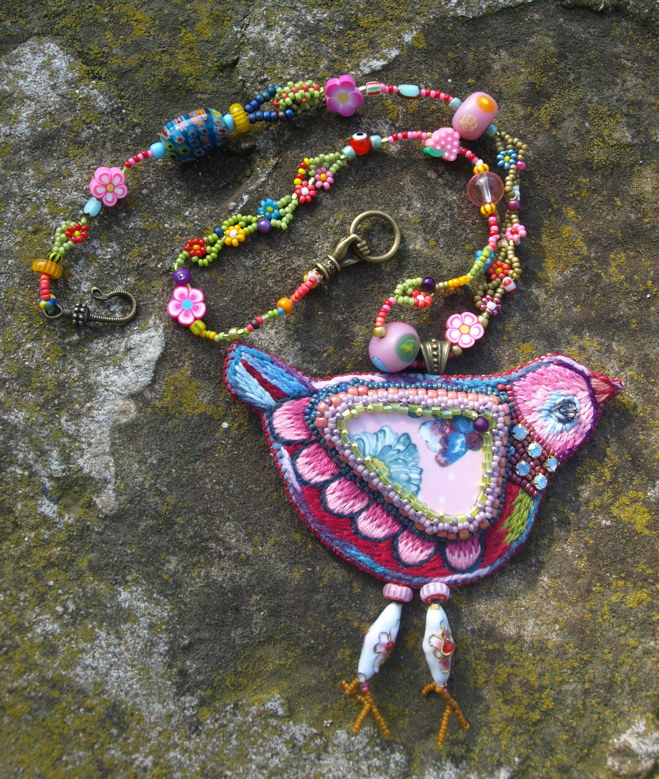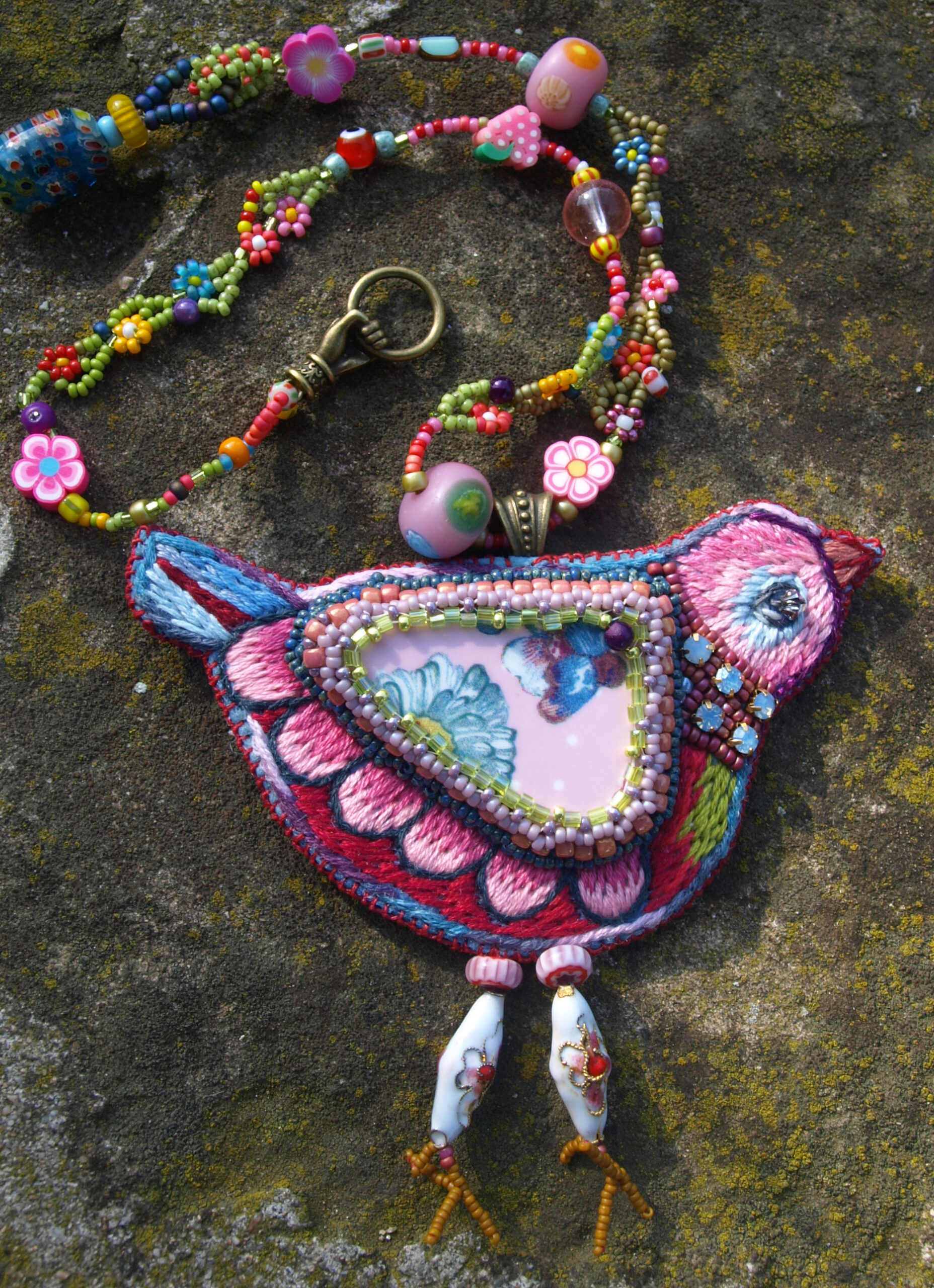 Pendentif oiseau : un morceau de vaisselle cassé serti de perles . Broderie de fils de coton sur feutre de laine. Doublure coton imprimé , signé. Collier de perles diverses , tissage de petites fleurs en perles miyuki .